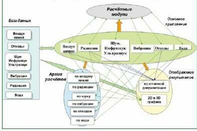 Общая архитектура ПК «Гарант-Универсал» представлена на рис. 3.1. Программный комплекс состоит из шести основных элементов – это база данных, расчетные модули, архив результатов расчетов, средства графической визуализации результатов расчетов и монитор, который связывает все шесть основных элементов по управлению и по базам данных. Основное приложение включает в себя шесть подсистем («Воздух», «Отходы», «Радиация», «Шум, инфразвук, ультразвук», «Вибрация», «Вода»). Каждая подсистема представляет собой набор программных компонентов и может функционировать как в составе программного комплекса, так и самостоятельно. Связь между программными компонентами и расчетными модулями осуществляется с помощью файлов определенной спецификации с заданием на расчет и с результатами расчетов. Результаты расчетов могут быть сохранены в специализированном архиве.