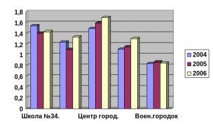 В таблице 9. приведены среднеквартальные значения веществ за период с 2004 по 2006 годы в районе центра города.