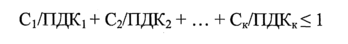 При совместном присутствии в воздухе нескольких веществ, обладающих суммацией действия, сумма их относительных концентраций (С/ПДК) не должна превышать единицы.