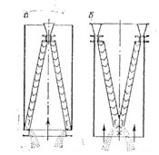 Рис. 6- Пластинчатые золоуловители ВТИ с одной (а) и с двумя (б) отсосными щелями