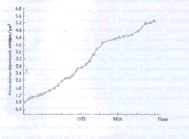 В АНГЛИИ, удаленной более чем на 8000 км от районов взрывов, общее количество только Sr90 за 4 года испытаний увеличилось в 7 раз (рис. 1).