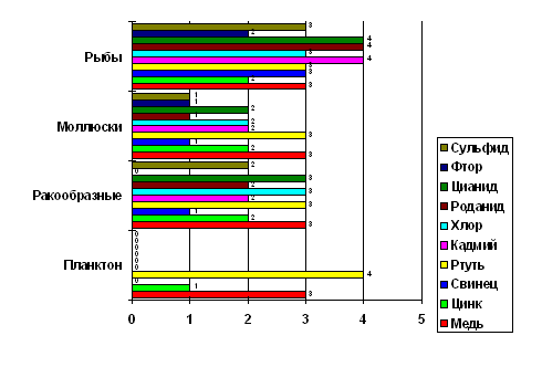 Основными неорганическими (минеральными) загрязнителями пресных и морских вод являются разнообразные химические соединения, токсичные для обитателей водной среды. Это соединения меди, цинка, кадмия, меди, фтора, хлора, ртути, свинца, цианида, роданида. Тяжелые металлы поглощаются фитопланктоном, а затем передаются по пищевой цепи более высокоорганизованным организмам. Токсический эффект некоторых наиболее распространенных загрязнителей гидросферы представлен на рисунке 1