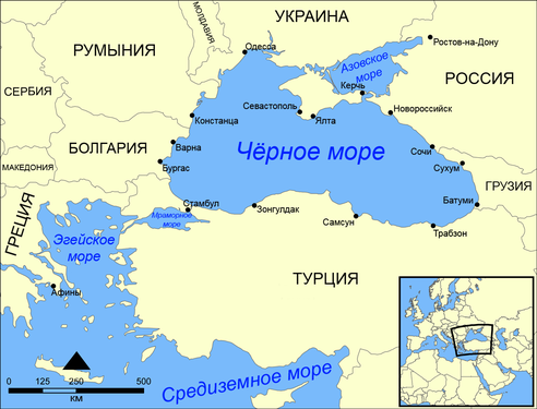 Черное море - внутреннее море бассейна Атлантического океана. Проливом Босфор соединяется с Мраморным морем, далее, через пролив Дарданеллы — с Эгейским и Средиземным морями (рис. 4). Керченским проливом соединяется с Азовским морем. С севера в море глубоко врезается Крымский полуостров. По поверхности Чёрного моря проходит водная граница между Европой и Малой Азией.