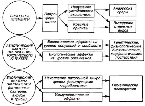 Все это отражается на состоянии отдельных популяций, на их взаимоотношениях. Таким образом, возникают экологические последствия загрязнения (рис. 9). Важным показателем нарушения состояния экосистем является изменение числа высших таксонов - рыб. Существенно изменяется фотосинтезирующее действие в целом. Растет биомасса микроорганизмов, фитопланктона, зоопланктона. Это характерные признаки эвтрофикации морских водоемов, особенно они значительны во внутренних морях, морях закрытого типа. В Каспийском, Черном, Балтийском морях за последние 10--20 лет биомасса микроорганизмов выросла почти в 10 раз. В Японском море сущим бедствием стали «красные приливы», следствие эвтрофикации, при которой бурно развиваются микроскопические водоросли, а затем исчезает кислород в воде, гибнут водные животные и образуется огромная масса гниющих остатков, отравляющих не только море, но и атмосферу[12].
