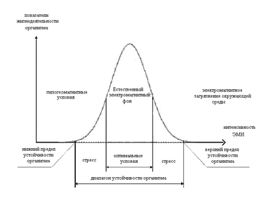 В соответствии со статьей 25 Федерального закона "Об охране окружающей природной среды" от 19 декабря 1991 г. № 2060-1, нормирование качества окружающей среды проводится с целью установления предельно допустимых значений факторов воздействия на окружающую среду, гарантирующих экологическую безопасность населения, сохранения генетического фонда, обеспечивающих рациональное использование и воспроизводство природных ресурсов в условиях устойчивого развития хозяйственной деятельности.[16] Основным критерием экологического нормирования ЭМП может служить положение, в соответствие с которым безопасным для экосистемы считается ЭМП такой интенсивности, при которой возможна потеря отдельной особи при обязательном условии сохранения стабильности экосистемы. При экологическом нормировании ПДУ ЭМП имеет смысл верхнего предела устойчивости организма, при превышении которого ЭМП становится лимитирующим фактором окружающей среды (см. рис. 1).