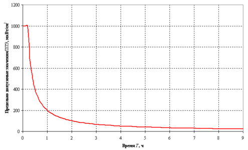 Рисунок 3. Предельно допустимое значение ППЭ в зависимости от времени контакта с источником ЭМП в условиях профессионального воздействия.