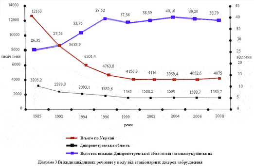 Мал. 3. Викиди шкідливих речовин у воду від стаціонарних джерел забруднення у Дніпропетровській області