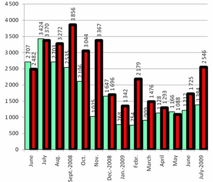 Графік сезонних коливань водовідбіру на зрошення та господарчо побутові потреби за 2008 рік наведено на мал. 2.