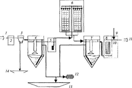 У - поступающая сточная вода; 2 - приемная камера с решёткой; 3 - тангенциальные песколовки; 4 - первичный вертикальный отстойник; 5 - насосная станция биофильтров; 6 - биофильтры с плоскостной загрузкой; 7 - вторичный вертикальный отстойник; 8 - биореактор доочистки; 9 - жидкий гипохлорит натрия; 10 - контактные резервуары; // - очищенная сточная вода; 12 - фильтр-пресс; 13 - аварийные иловые площадки; 14 - песковые площадки или бункера.