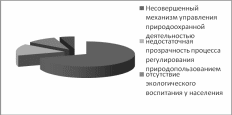 Наиболее актуальные проблемы выстроились в следующем иерархическом порядке: несовершенство механизма управления природоохранной деятельностью – 70% ответов; недостаточная прозрачность процесса регулирования природопользованием – 15%; отсутствие экологического воспитания у населения – 10%; слабая реализация экологической политики – 5%.
