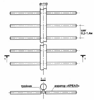 Аэрационное оборудование представляет собой аэрирующие модули, состоящие из труб ПНД (d=110-160 мм), на которых через пластмассовые тройники попарно крепятся аэраторы. Ширина модуля - 1,1 м; шаг между аэраторами - 0,2-1,4 м. Модули размещаются в несколько рядов с интервалом до 1,1 м, образуя широкую аэрируемою полосу, отвечающую ширине аэрируемого сооружения, что позволяет поддерживать активный ил во взвешенном состоянии даже при низкой интенсивности аэрации (2 м3/м2 час). Изменение шага между аэраторами позволяет изменять интенсивность аэрации в широком диапазоне, обеспечивая оптимальный кислородный режим.