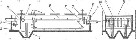 Нефтеловушки представляют собой горизонтальный отстойник (рис 12), разделённый продольными перегородками 10 на самостоятельно работающие секции 11. Число секций назначается в зависимости от расхода сточных вод.