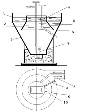 Песколовка с круговым движением рабочего потока (рис 11) представляет собой круглый резервуар 1 с коническим днищем 3. внутри резервуара расположен цилиндр с усечённым конусом 2, которые с корпусом песколовки образуют кольцевой лоток 5, имеющий в нижней части щелевое отверстие 6 для отвода осадка.