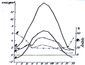 У середньому за рік на земну поверхню району надходить 92,7 ккал/см2 тепла. Альбедо – відношення відбитої радіації до сумарної, змінюється за сезонами і залежить від особливостей підстеляючої поверхні, влітку альбедо у лісових масивах становить 10-19 %, взимку вкрита снігом поверхня відбиває до 70-75% сонячної радіації. Радіаційний баланс за рік становить 34-38 ккал/см2 [30].