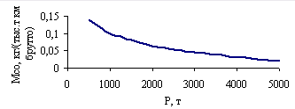 Рис. 3.3.1. Изменение значений удельных выбросов СО грузовыми тепловозами в зависимости от массы поезда, тепловозы серии ТЭ116