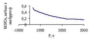 В этой формуле удельный выброс загрязняющего i-го вещества одной секцией тепловоза j-ой серии за единицу грузовой или пассажирской работы, приведённой к единому измерителю (кг вещества/тыс. км), определятся для грузовых поездов по рис.1-3 в зависимости от фактической или средней массы поезда.