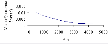 Рис.3.3.3. Изменение значений выбросов сажи грузовыми тепловозами в зависимости от массы поезда, тепловозы серии ТЭ116