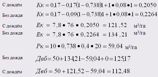 Таблица 2.16 Расчет Кб, Ек м3/га, Рк м3/га и Двб подекадно (древесная флора).