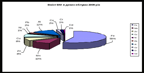 Рисунок 3.24- Відсотковий вміст металів у пробах яблук, 2009 рік.