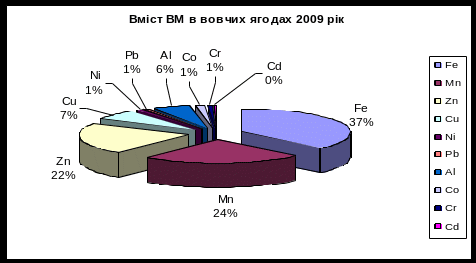 Рисунок 3.26- Відсотковий вміст металів у пробах вовчих ягід, 2009 рік.
