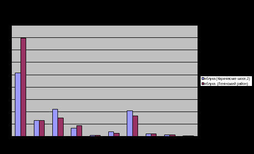 Порівнявши результати дослідів можна зробити висновки, що в Ленінському районі плоди яблук важкими металами забрудненні більше ніж плоди яблук в Жовтневому районі, це може бути зумовлено високим показником забруднення цього району.
