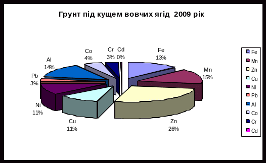 Рисунок 3.22- Відсотковий вміст металів у грунті під кущем вовчих ягід, 2009 рік.