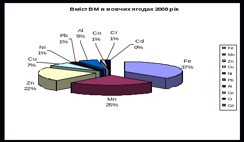 Рисунок 3.25- Відсотковий вміст металів у пробах вовчих ягід, 2008 рік.