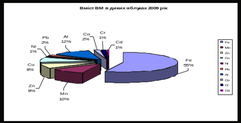 З поданих діаграм можна визначити, що для яблук бальший вміст мають такі метали як залізо, марганець та цинк, найменьший вміст хрому та кадмію. Вміст цих металів у вовчих ягодах інший, ніж у яблуках. У вовчих ягодах заліза на 1/3 меньше, марганцю та цинку у 2,5 раза більше, ніж у яблуках. Мінімальний вміст хрому та кадмію на рівні кількості у яблук.