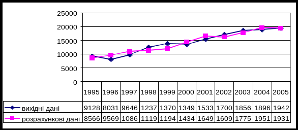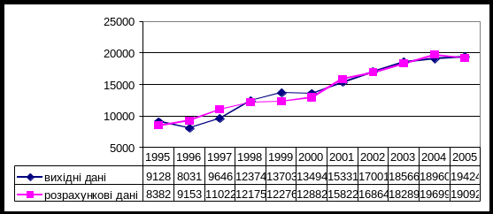 Наглядно співвідношення вихідних та розрахункових даних за першою моделлю кількості малих підприємств у Дніпропетровській області наведено на рисунку 3.6.