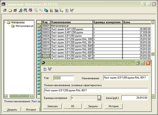 Справочник «Материалы» предназначен для хранения сведений о материалах, участвующих в процессе производства, и является одним из наиболее значимых в конфигурации. Справочник «Материалы» используется для выписки документов, для выбора основного материала при заполнении справочников (рисунок 3.7). В справочнике предусмотрена трехуровневая иерархия.