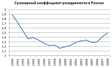 Рождаемость в России не достигает уровня, необходимого для простого воспроизводства населения. Суммарный коэффициент рождаемости составляет 1,6, тогда как для простого воспроизводства населения без прироста численности необходим суммарный коэффициент рождаемости 2,11–2,15.