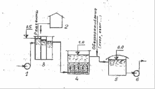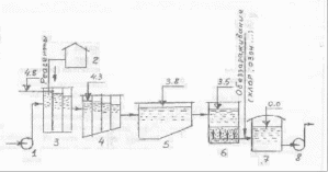 Глубокое осветление, обесцвечивание и обеззараживание воды путем коагулирования и последовательного осветления воды в отстойниках и на фильтрах. Природная вода насосами 1 подъема 1 подается в смеситель 3, куда одновременно подаются реагенты, приготовленные в реагентном цехе 2.