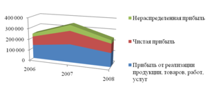 Необходимо отметить, что в 2007 году прибыль по сравнению с 2006 увеличилась на 32%. За 2008 год наблюдается значительное падение общей массы прибыли, полученной в результате хозяйственной деятельности МЗХ. Ее объем снизился на 42 831 млн. р., и составил 126 634 млн. р., что ниже прошлогоднего уровня на 25%. В результате этого падения, снизились объемы как чистой, так и нераспределенной прибыли (рисунок 1).