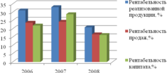 Рентабельность продаж определяет размер прибыли на рубль реализации. В 2006 году она составляла 23,7%, в 2007 – 24,3%, в 2008 году 16,7 %.