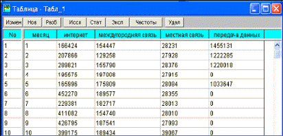 Приведем пример файла биллинговой системы для прогнозирования объемов четырех видов услуг: международная связь (М), местная связь (МС), передача данных (ПД) и Интернет (И) с учетом фактора времени, в качестве которого выступает месяц предоставления услуги (месяц), представленного на рисунке 2.2.1, где значения по видам услуг отражены в рублях.