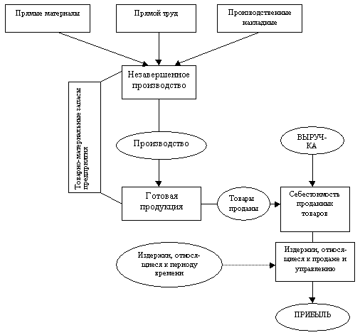 Согласно этой схеме, ресурсы предприятия, которые формируют издержки, относящиеся к продукту, являются активами предприятия до тех пор, пока предприятие не продаст готовую продукцию. В то же время, издержки, относящиеся к периоду времени, признаются издержками предприятия именно в тот период, когда они были понесены, независимо от того, была продана готовая продукция или нет.