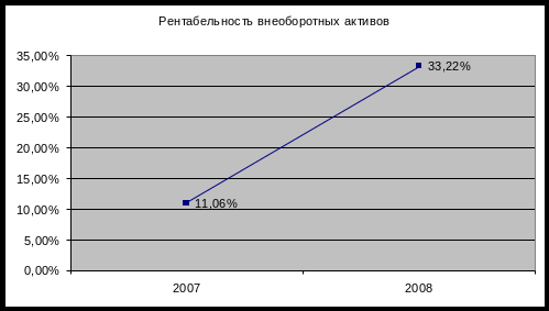 Как видно из графика, рентабельность внеоборотных активов 2008 г. увеличилась и оставила 33,22%. Т.е. прибыль предприятия с одного рубля вложенных средств во внеобортные активы увеличилась на 22,16%, по сравнению с 2007 г.