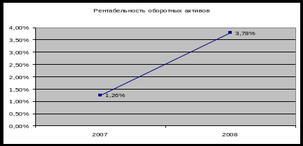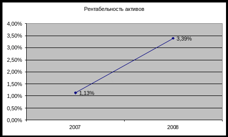 Рентабельность активов показывает, сколько денежных единиц прибыли получено предприятием с единицы стоимости имущества (активов) независимо от источников финансирования. Таким образом, как видно из представленного выше графика, в 2008 году рентабельность активов выросла и составила 3,39%, что на 2,26% больше, чем в 2007 году. Это значит, что предприятие в 2008 году получило прибыли с каждого рубля стоимости активов на 2,26 рубля больше, чем в начале отчетного периода.