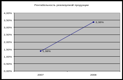 В 2008 году произошло увеличение рентабельности реализованной продукции, по отношению к 2007 году. Это означает, что в 2008 году каждый рубль стоимости реализованной продукции принес предприятию 3,36 рубля, в том время как в 2007 году – 1,38.
