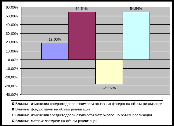 Как видно из рисунка 2.8, наибольший удельный вес имеют материалоотдача и фондоотдача, они оказывают наибольшее влияние на изменение объема реализации.