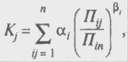 где i = 1,..., n — число параметров продукции, участвующих в оценке; у = 1, ..., n — виды продукции; аi — коэффициент важности (значимости, предпочтительности) для покупателя i-го параметра по сравнению с остальными существенными параметрами продукции; Пij — конкурентное значение i-го параметра для j-й продукции; Пin — желаемое значение i-го параметра, которое позволяет полностью удовлетворить потребность покупателя; Bi = + 1, если увеличение параметра Пij способствует росту конкурентоспособности продукции (например, надежности, производительности изделия и т.д.); Bi = - 1, если увеличение значения параметра Пij приводит к снижению конкурентоспособности продукции (например, вес, габарит, цена и др.).