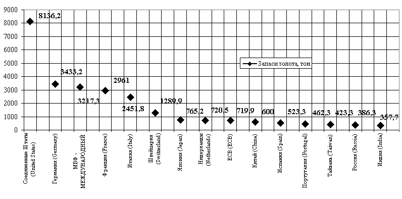 Рис.1.4 – Розподіл запасів золота в резервах національних банків країн світу, тонах