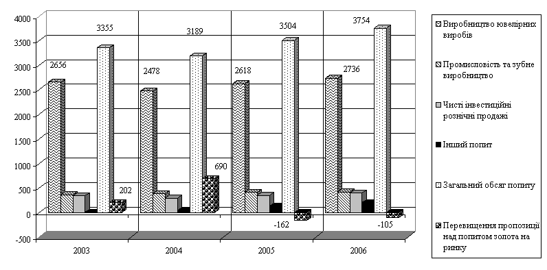 Рис.1.6 – Структура та обсяги попиту (продаж) золота на світовому ринку у 2003 –2006 роках