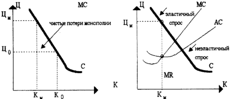 Как видно из рисунка 4 (а), в этом случае монополия имеет потери, так как ряд потенциальных преимуществ маркетинга остается нереализованными. Однако существуют и некоторые позитивные моменты деятельности монополии. Опасаясь появления на рынке конкурентов и товаров-заменителей, монополист вынужден стимулировать развитие базовых технологий как с целью минимизации издержек, так и для разработки новых, более совершенных товаров. Кроме того, экономия на масштабах производства может превысить (с точки зрения экономической эффективности) целесообразность создания условий для конкуренции.