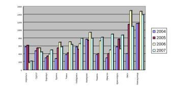 Рис. 2.2 Поступления от земельных платежей в городах, входящих в Ассоциацию сибирских и дальневосточных городов, в 2004-2007 годах (млн р.)