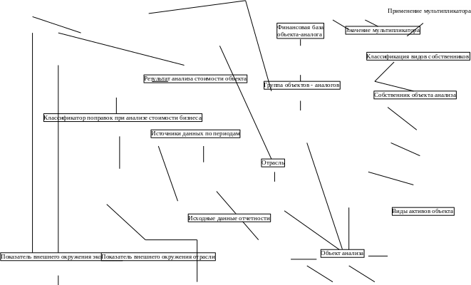 Рассмотрим механизм построения концептуальной модели. Основная цель построения концептуальной модели представляется в выявлении и адекватном представлении информации для процесса анализа и ее организации, необходимой для эффективной реализации процесса анализа бизнеса. Рассматривая предметную область с точки зрения удовлетворения ее информационных потребностей, то есть с позиций трех основных подходов в анализе бизнеса, выделим в качестве относительно устойчивых и основных элементов этого процесса следующие: объект анализа, объект - аналог, метод анализа, показатели объекта анализа, цель анализа, структура капитала, которые соответствуют любому процессу анализа и описываются в виде сущностей «объект анализа», «объект - аналог», «показатели объекта анализа», «цель анализа», «структура капитала» и др. На этом основании элементы процесса анализа бизнеса описываются в концептуальной модели (далее КМ) в виде сущностей (рис. 6.)