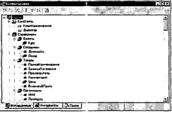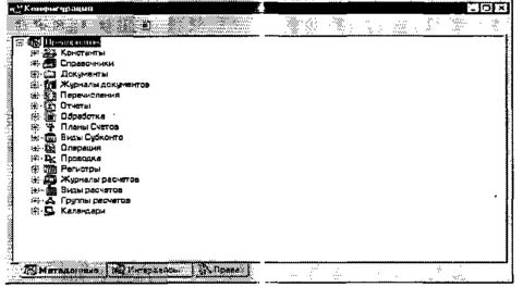 В процессе конфигурирования формируется структура информационной базы, алгоритмы обработки, формы диалогов и выходных документов. Информационная структура проектируется на уровне предусмотренных в системе типов обрабатываемых объектов предметной области (константы, справочники, документы, регистры, перечисления, журналы расчетов, бухгалтерские счета, операции, проводки и др.).