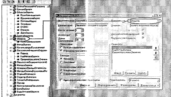 Первый - механизм связывания сущностей через типы реквизитов, реализован для связи сущностей «объект анализа» и «отрасль». В состав реквизитов справочника «Объекты Анализа» - сущность «объект анализа», включен реквизит «Отрасль», которому определен тип «Справочник. Отрасли» - сущность «отрасли» (Рис. 24.).