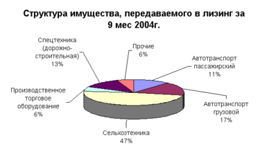 Доля сельскохозяйственной техники составляет порядка 47%, половина которой финансируется за счет средств республиканского бюджета, другая половина за счет средств коммерческих лизинговых компаний. Положительные сдвиги в развитии сельского хозяйства, накопленный положительный опыт работы сельчан с лизингом при активной государственной поддержке, вызывают интерес в настоящее время и для лизинговых компаний, нефинансируемых из бюджета.