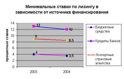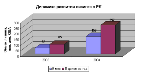Лизинг динамично развивается. В 2003 году объемы лизинга выросли в 4 раза по сравнению с 2002 г. и составили порядка 85 млн. Долларов США. За 9 месяцев 2004 данный показатель увеличился в три раза по сравнению с аналогичным периодом 2003г и составил порядка 156 млн. Долларов США.